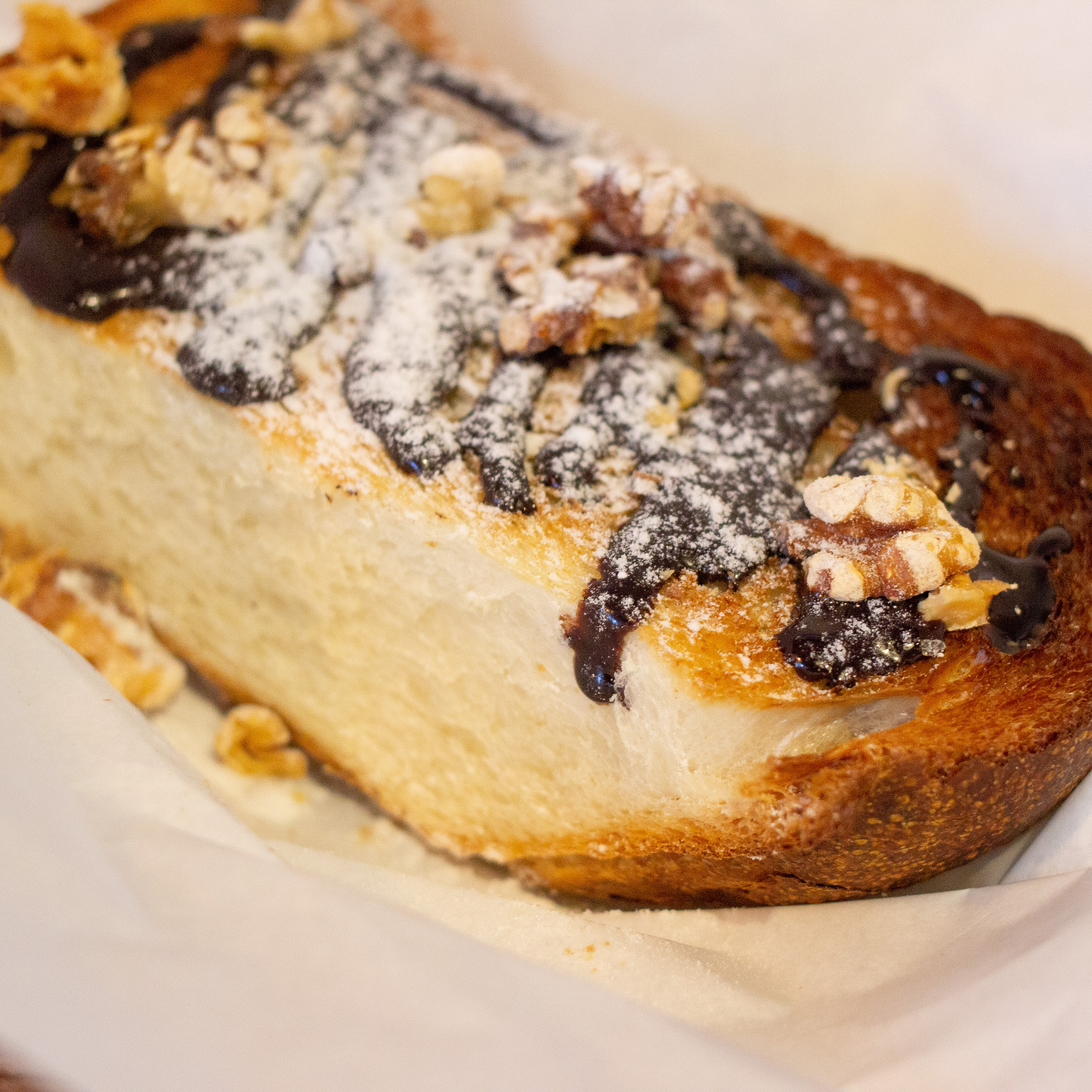 自家製のパンに100%ナチュラルのチョコレートソースをかけてくるみをのせて。